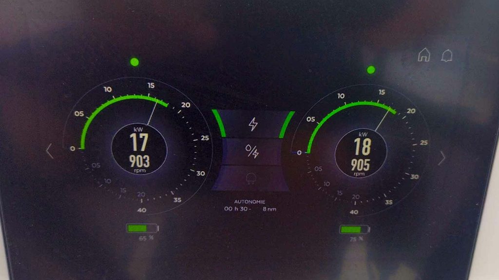 The display differs from that of a diesel engine’s tachometer. On the Smart Electric display, once the electric propulsion is engaged (a combination of buttons to be pressed), propeller revolutions are shown, but it is mainly the instantaneous power of each motor that interests the skipper.