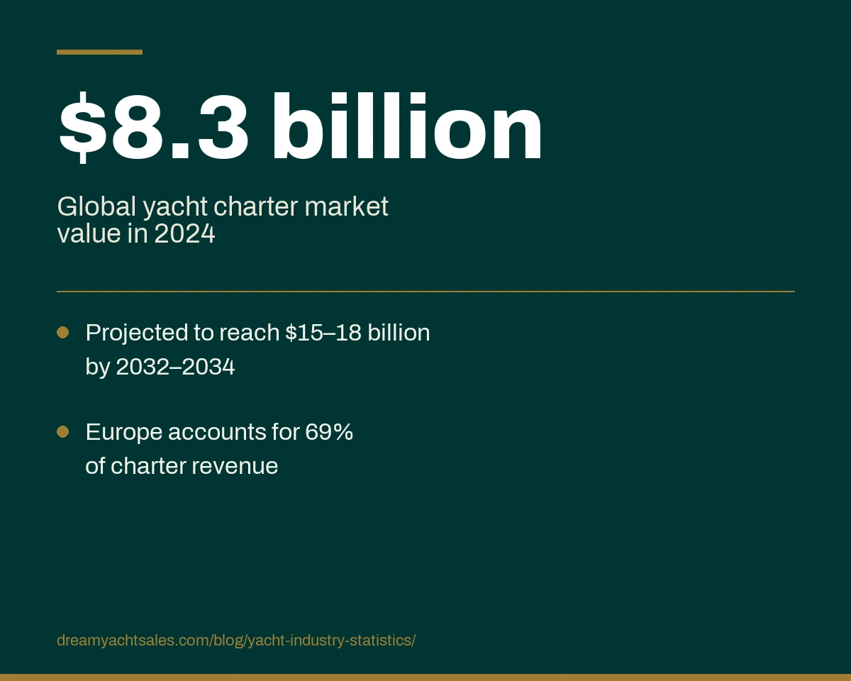 - The global yacht charter market alone is worth around USD 8.3–8.4 billion in 2024, with projections to reach USD 15–18 billion by 2032–2034 at a CAGR of about 8%.