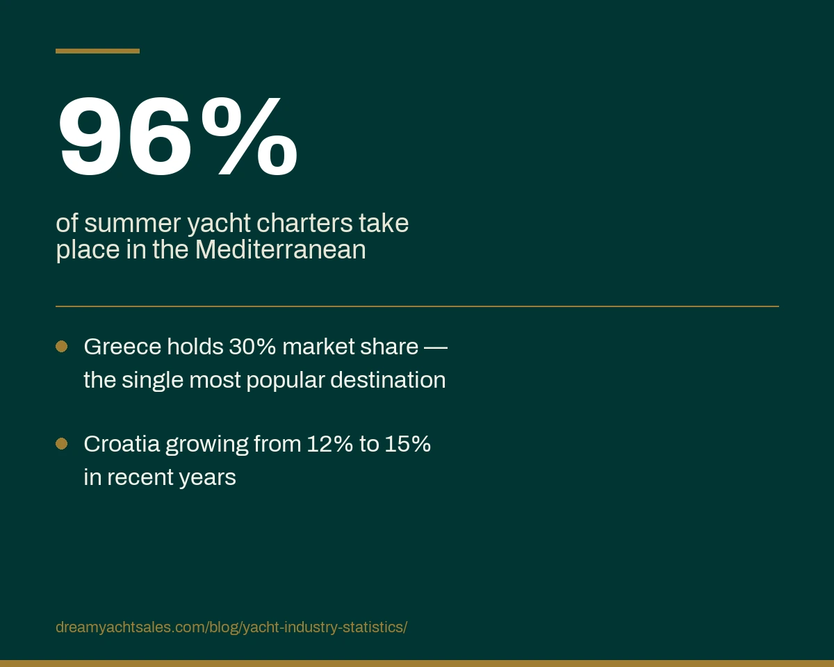 - Greece accounts for roughly 30% of summer charter market share and 26% of annual bookings, making it the single most popular yacht charter destination.