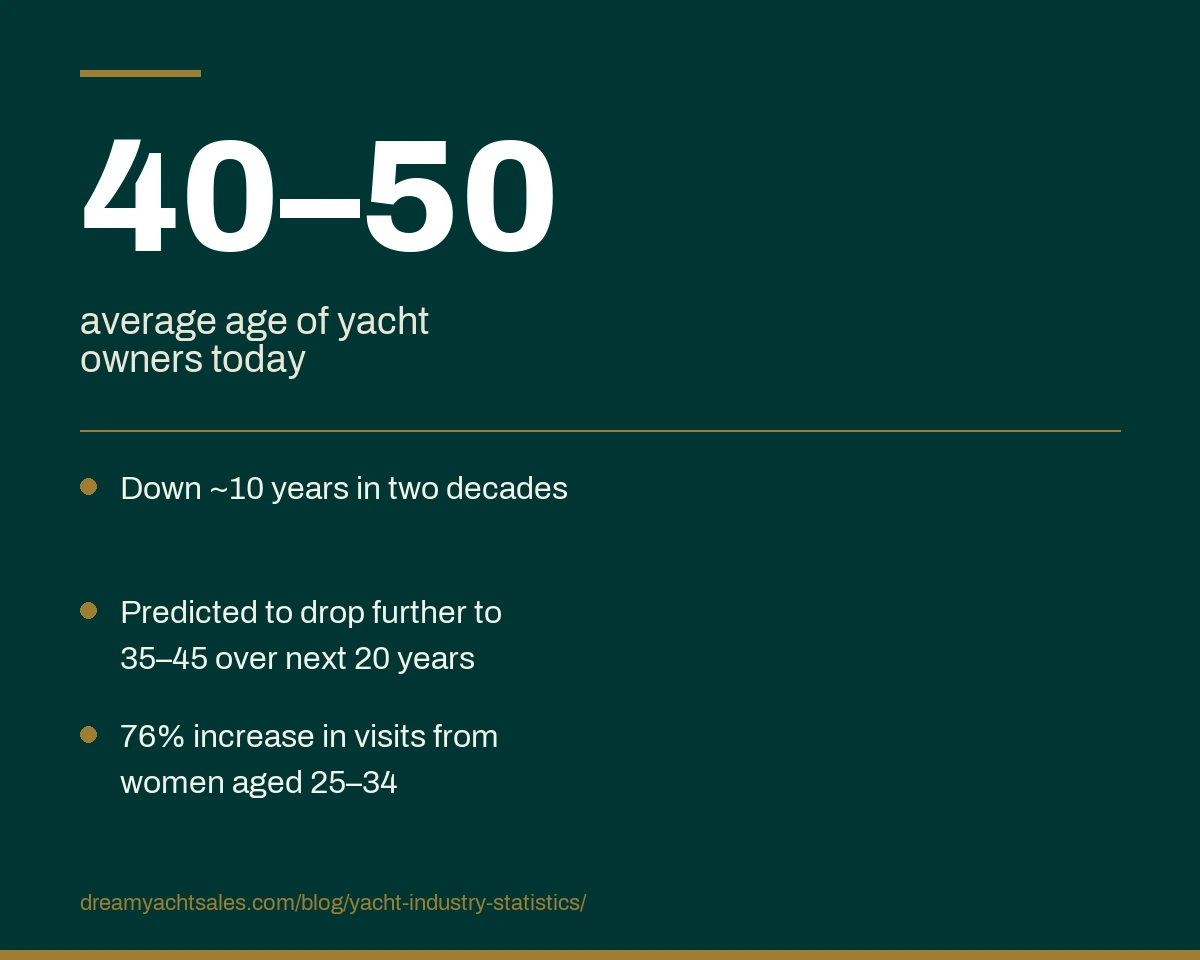 - The average age of yacht owners has fallen by roughly 10 years in the last two decades, now typically in the 40–50 range.