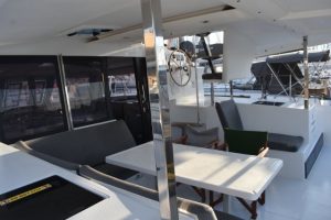 Her inverted bows, her innovative saloon where the chart table adjacent to the entrance gives way to a “total relaxation” lounger, her performances and her habitability (3 or 4 double cabins + an optional crew cabin) combine to make this new model an exceptional catamaran.