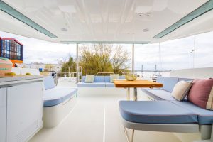 Solar Integration: Sleek solar panels are seamlessly built into the coachroof, providing renewable energy to support on-board systems and reducing overall engine reliance.