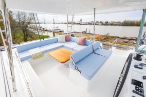 Luminous Interior: Inside, the owner’s suite remains a sanctuary of peace, featuring a walk-in closet and panoramic hull windows that flood the cabins with natural light.