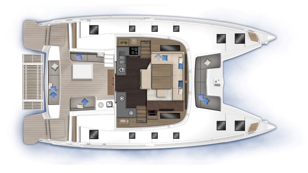 The Lagoon 51 Iconic is defined by its expansive social hubs and seamless connectivity. As a premier flybridge catamaran, it offers a vast upper deck with 360-degree views, making it the ultimate destination for sunbathing or hosting guests while underway. At the stern, the wide transoms and optional hydraulic platform create a private beach club at water level—perfect for swimming, diving, or easy tender access.